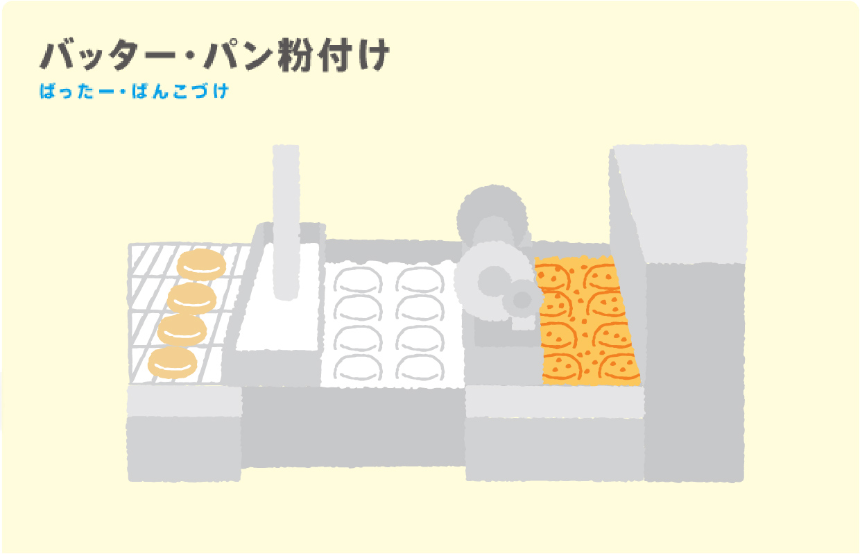 Mama:バッターといって、小麦粉を水で溶いたものよ。素材にパン粉をくっつけるために大切な工程なの。