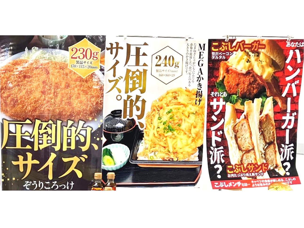 230 gの大わらじメンチや、240 gのMEGAかき揚げなど、思わずバイヤーも笑ってしまうほどの大きさの商品が